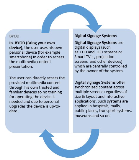 The multimedia information is accessible either with centrally controlled fixed devices (digital signage) or through the mobile devices of people who are located within the network area (BYOD, Bring Your Own Device concept). Both means are used as a network of electronic displays that are centrally managed and individually addressable for the display of text, animated or video messages for advertising, information, entertainment and merchandising to targeted audiences.